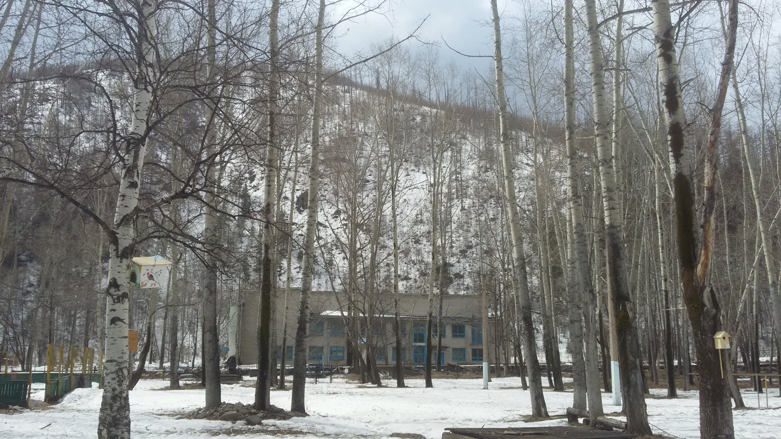 Вся дорога до посёлка заняла примерно час, сорок минут, с учётом 20 минут пересадки в Солнечном. Типичный репертуар маршрутного автобуса - шансон и "Руки вверх". Связь МТС по приезду вообще не ловила - что-то сломалось в этот день. На улицах Горного лежат мокрые сугробы, местами текут ручьи. Слышен постоянный шум неподалёку. Как оказалось - водопад. Но горный ручей ещё не до конца разошёлся. Через пару недель отойдёт и зашумит в полную силу - тогда будет вообще красиво. Кругом чёрно-белые склоны с пятнами нерастаявшего снега. Скоро должен зацвести багульник, и тогда все сопки окрасятся в розовый цвет. Возле самой речки и в песочных протяжённых ямах лежит снег.